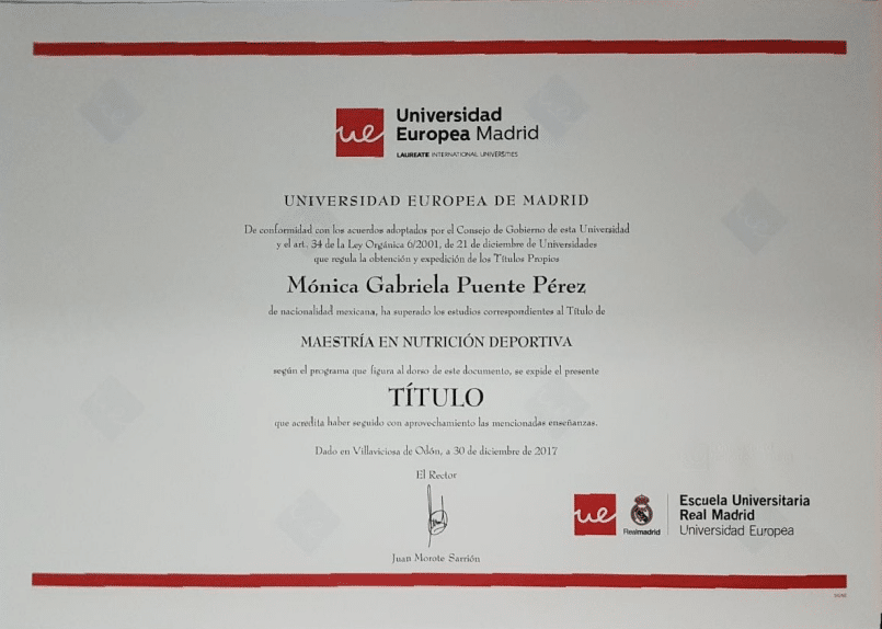 Soy Mónica Puente, licenciada en Nutrición por la UVM y maestra en Nutrición Deportiva por la Universidad Europea del Real Madrid.