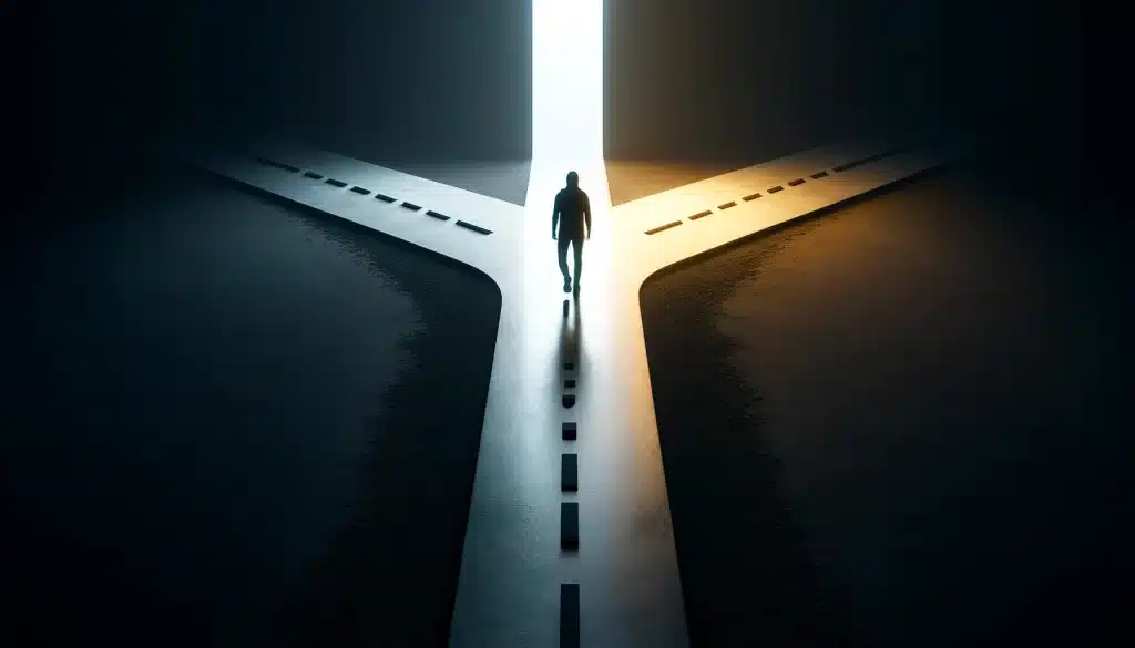 Una imagen hiperrealista y minimalista que muestra a un individuo en una encrucijada, simbolizando la decisión de salir de la zona de confort. Un camino oscuro y transitado representa lo conocido, mientras que un sendero brillantemente iluminado y desconocido se abre ante la persona, invitando a la elección de explorar nuevas posibilidades.